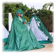 ★ 外帳是件大斗篷:傾盆大雨而下,馬上披著繼續在林間打坐,斗篷大到足夠將行李和坐墊完全蓋住。這件大斗篷一方面是帳篷外帳,然而打開通風窗縫