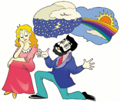 一個男人對一個女人說:「親愛的!沒有了妳,每件事物都變得昏暗沉悶,烏雲密佈,狂風暴雨;而妳就像一道美麗的彩虹,為我帶來溫暖的陽光。」女人問:「你到底是在求婚還是在報告氣象?」