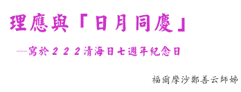 我記得好清楚,就在師父透過麥克風向大家說完「再見!」的下一剎那,我又再度抬頭,想「看看」太陽,天啊!太陽那能用看的,好刺眼!這時我才回過神來,是啊,亞熱帶的五月艷陽,可是會燒人眼睛的,怎能直逼著他看呢。然而,那一天,我的確曾經仔仔細細地雙眼直視五月的豔陽好多回!