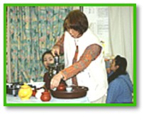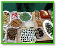 稍後我們舉行了素食品嚐會,桌上擺滿了同修用愛心製作的各式美味佳餚,在會場的一角,還有素食製作及中國茶藝的示範表演。大家在和諧的氣氛中,一起分享了豐盛的食物,並沐浴在上帝的愛海裡。