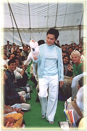 12月23日清晨,來自世界各地的同修步經雲霧繚繞的湖畔,井然有序地進入打坐大殿。同修們渴望見到師父的心願,於禪四一開始就實現了。師父於此刻到來,彷如一位慈母在半夜中探視她熟睡的孩子一般,令人感到十分溫馨;當師父帶領大家唸佛號時,那溫柔美妙的聲音更是在整個大殿迴盪縈繞。