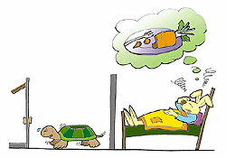 然後,一個小時過去了,二個小時過去了,三個小時過去了,四個小時也過去了!但就是看不到烏龜的蹤影。這隻宿醉的兔子攤在床上,頭痛欲裂,感到昏天暗地,忍不住罵了起來:「這隻笨烏龜,等一下他回來的時候,我一定要他好看!我的頭痛成這樣,他卻不知道跑到哪裡去!藥房就在轉角而已,真是個大笨蛋!」他說完十五分鐘後,聽到烏龜的房裡傳來聲音,說道:「你居然把我罵得這麼難聽,我不要再繼續往前走了!」
