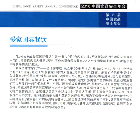 「中國食品安全年會」的會刊中介紹愛家,刊載 :