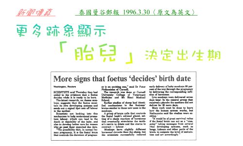 【華盛頓路透社報導】科學家聲稱他們於星期四增加了一個證據,證明胎兒決定自己什麼時候出生。最近以恆河猴為對象的研究中,得知胎兒監看自己的生長系統,並給母親發出分娩訊息。 科學家進一步據此來研究,了解早產所引致的嬰兒死亡或殘障,以及如何發展對晚產婦女更好的照顧。 康乃爾大學•彼德博士表示:「在正常人的懷孕過程中,由胎兒的腦部控制懷孕期間的這種可能性,是項令人興奮的研究。」康乃爾大學獸醫學院和西奈山醫學院先前所做的綿羊研究,印證胎兒腦部的運作跟現在對猴子的研究,所見是差不多的。一組腦部細胞控制綿羊胎兒的副腎上腺,發出一連串的荷爾蒙連鎖反應,刺激母親的子宮頸部擴張及子宮收縮分娩。猴子和綿羊的荷爾蒙循環系統有些微不同,但科學家成功的注入適量的荷爾蒙來催生猴嬰,減少百分之八十的懷孕時間。 七天後,活生生的小猴子就出生了,而控制組的母猴,只注射安慰劑,則需要多二十天才生產。對於人類系統的研究,還要花更多的工夫,但那塔尼茲表示這項研究,已經令人興奮。「如果胎兒的腦部能夠如同一部『電腦』般的運作,從各器官,如肺、腎臟或頭腦其它各部分接收訊息,來計算成熟度,並依據來做反應,這項研究將有救命的重大價值。」