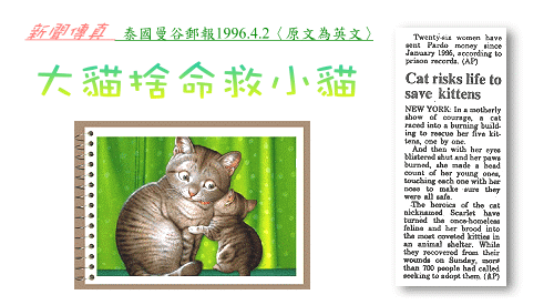 【紐約訊】一隻母貓衝入一幢火災大廈裡,陸續救出五隻小貓,展現出牠英勇的母愛。然後牠用那被火燒傷起泡而睜不開的眼睛及蜷起受傷的爪子,一個一個點算牠的小孩,並用鼻子去觸摸每一隻小貓,確定牠們都安全無礙。