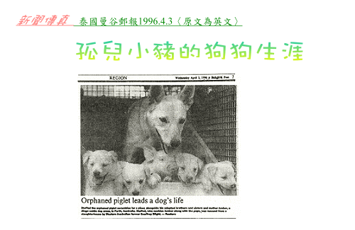 這隻吃得飽飽的孤兒小豬努力攀爬,為了要在牠的養母及養兄弟姊妹之中取得一席之地,心滿意足的牠,是被一位西澳農民喬治•柏萊特從屠房中救出,讓牠和這些狗兒一起,由澳洲柏斯的一條牧羊犬「愛瑪」哺乳。