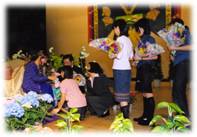 講經結束時,師父很優雅地接受一些小朋友和青少年的獻花,隨後,師父將講台上所有的鮮花、水果分享給來賓。