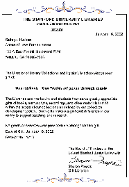 对于能收到书籍、手稿、录制品以及合乎本馆藏发展政策所制定之收藏范畴的资料,本校图书馆暨全体教职员生均对捐赠者深表感激之意,您致赠的礼物将使本馆在教学与研究方面的支援能力有显著的提升。