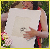 答:我用黑白两种对比颜色,来强调人们内在所散发的光芒,就像在白纸上写上黑字,清楚简明,这样就够了。譬如,这幅主题为「…在阳光中微笑著…」的铜版画,我们可以看得出画中的老妇人,她内心非常快乐,好像陶醉在阳光里。我注意到欣赏过这幅画的人,都能感受到画中所传达的光和喜悦(图1)。