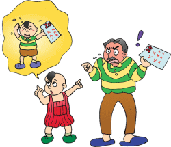 一个小孩拿成绩单回家,他是班上成绩最差的一个。他的爸爸看了成绩单以后非常生气,责骂他说:“你的功课老是殿后!你看邻居的小孩,总是得第一名,你却每次都拿最后一名,告诉我,到底怎么回事?难道你们老师什么都没有教你吗?”儿子说:“有啊,有啊,今天早上,她还教我们‘有其父必有其子’。