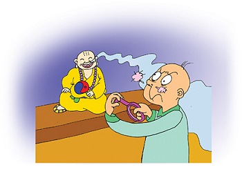 他拜的时候,看到檀香的烟飘到阿弥陀佛像的鼻子那里,他想:“这不行!我只拜观音菩萨而已,你这尊佛根本不灵,哪有资格享受我的香呢?”(大众笑)于是就把阿弥陀佛像拿下来,然后用胶带把它的鼻子封起来,不让它闻那个香味。那个时候阿弥陀佛的木头像忽然不见了,然后阿弥陀佛本尊出现在他面前。那个信徒吓坏了!就跪下来,请祂饶命。阿弥陀佛说:“我对你的道心和诚心非常满意。现在你要求什么,我都会让你实现。”那个人说:“能够看到您,我已经很高兴了,一下子不晓得要向您求什么。不过,请您解释给我听,为什么当我要把您的鼻子封起来时,您才出现?这是什么意思呢?”