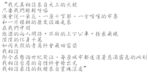 音乐会中,杨平先生在一位师姊的古筝伴奏下,吟诵了<穿过前世的长廊>、<相信>、<在闲闲流逝的宁静里>等诗作,这些诗文充满性灵之美,并流露出诗人对和平的向往,堪称是脍炙人口的佳作。以下摘录自杨平先生的<相信>一诗: