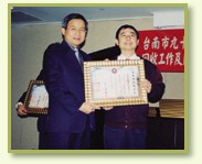 元月21日,台南市政府颁发奖状给各公益团体,清海无上师世界会因长期以来定期参与环保净滩工作,风雨无阻,受台南市政府肯定,也在受奖之列。由市长许添财先生(左)亲自颁奖。