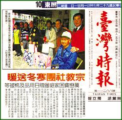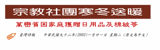 【记者王荣信万峦报导】清海无上师世界会昨天在屏东县万峦乡新置村举办寒冬送暖活动,发放棉被等日用品及慰问金给低收入户及失业贫困家庭,乡长徐统盛特别向世界会的会员致谢。
