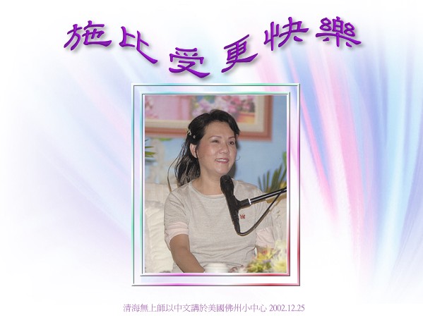 我就跟那位经理说:“我能不能帮他们付之后的搬运费?我现在先付,等他们搬家的时候,你们再来帮他们搬。”那两个小孩听了好高兴、好快乐!他们就向我要地址、电话、名字等等(师父和大众笑),我说:“不、不!我很忙,对不起!这算是送给你们的,你们高兴就好了,其他的别问。”然后我就跑了。
