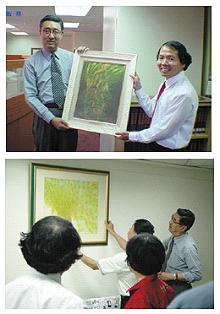 【台北讯】清海无上师世界会台北小中心为感谢立法院国会图书馆馆长顾敏先生热心响应世界会各项公益活动,特别于2003年4月23日上午,赠送师父的复制画作给馆方,由顾敏馆长于立法院四楼图书馆,亲自收下赠与的9幅复制画。