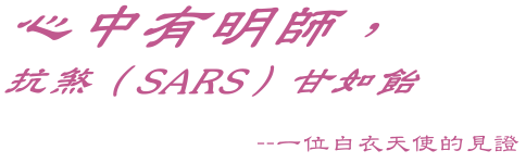 疫情爆发初期,眼见同事们一个一个因感染SARS而倒下,我的心中非常的难过。在成为白衣天使的二十年来,自己从没有想到这份工作会面对死亡的威胁,我唯一能做的只有尽力去照顾他们、安抚他们的心灵,并希望他们可以早日康复。当疫情最严峻时,所有的医护人员都根据抽签的次序,随时准备到“SARS”病房去工作,以接替那些在“战场”上已经倒下或战斗到精疲力尽的同事。尽管“抗煞”激烈,但我的心中却没有丝毫惧怕,我知道在师父的爱力保护下,一定会安然无恙。我真的很感恩上帝赐给我这份“白衣天使”的工作,让我可以亲身服务众生,在他们最需要别人关怀、照顾的时候,藉着我的工作去传送“祂”对人类的慈悲与爱。