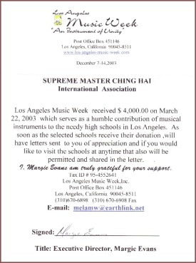 在《和平之音.四海一心》慈善音乐会上,无上师曾慷慨捐款给二所儿童慈善机构:圣裘迪儿童研究医院以及星光儿童基金会,为罹患不治之症的儿童带来温馨的关怀。继洛杉矶音乐周及洛市颁奖典礼活动后,为音乐学子所设立的儿童日也揭开序幕,当天,清海无上师的爱透过百本《和平之音.四海一心》精装乐曲专辑一书的捐赠,温暖了与会学童的心田,无上师同时也捐赠四千元美金,帮助贫困孩童接受更好的音乐教育和购置乐器。以下是玛姬.伊梵思女士的回函,文中表达出对无上师爱礼的深深感谢。伊梵思女士也诚挚地邀请无上师莅临与孩童见面。
