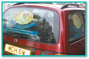 此外,为了将小中心重新开幕的消息广传给大众,我们想到透过同修的汽车来宣传是不错的方式。于是我们设计了一款小中心的标志,上面印着师父美丽的法相和小中心的联络资料,可以很方便地展示在车窗上。许多同修在得知利用汽车来分享师父教理非常有效果后,都纷纷向我们索取小中心的标志。现在每当我们开车经过市区、载小孩上学、停车上班等等,都在推广师父的教理!
