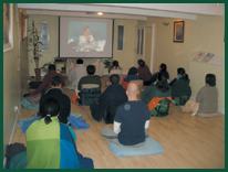 小中心一楼原是录影带商店,经过重新整修后,已成为现在的打坐大殿及接待厅。两个月的整修期间,同修们同心协力,将原本老旧的房舍转变成美轮美奂、展示着师父画作与万岁灯的共修中心。来宾可直接进入前方的接待厅,在这里观看师父录影带、阅读师父教理,或与同修讨论打坐修行的话题。