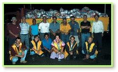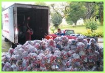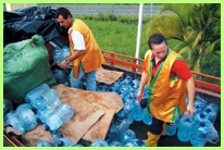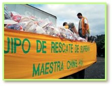 同修听到这个消息都非常高兴。不过,政府当局认为在路况依然险恶的情况下,贸然在夜间行驶是不智之举。尽管如此,同修仍持续装载物资。当同修的卡车正准备上山前往苏瑞卡社区时,一辆载着30几个人的卡车刚好抵达,他们正是将桥梁修复的原住民同胞。由于时间紧迫,他们尽其所能地将他们那一辆卡车也装满物资,如此一来,我们就可以将1400多袋食物与1500多瓶2加仑装的饮用水运抵灾区,分送给那些需要的灾民。凭藉着对师父力量的信心,我们知道每件事都会得到妥善的安排。