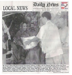 清海无上师世界会韩国救援队,会同斯里兰卡住屋营建部副部长全德拉喜瑞.加爵迪拉(Chandrasiri Gajadeera),在马塔拉(Matara)及安帕拉(Ampara)展开赈灾工作,援助卡尔穆奈(Kalmunai)与马塔拉的灾民,救援队将购自韩国的干粮、用具、药品、帐篷及婴儿奶粉等物资分送给灾民。图为韩国救援队探访安帕拉时,队长将世界会准备援助海啸灾民的物资递交给住屋营建暨东部教育和灌溉开发部长菲利尔.艾许拉夫(Ferial