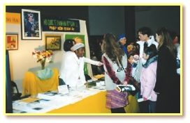 尽管会场上的展示品五花八门、种类众多,但仍有许多来宾驻足在同修的摊位前,凝视着高雅的师父法相海报,流露出深切的仰慕之情。去年曾光临我们摊位的一位女士,今年又再度来访,并索取许多新闻杂志,她说:“你们的师父实在太漂亮了,我想多收集她的近照。”虽然附近摊位所播放的音乐喧天震耳,但很多来宾仍然聚精会神地观看电视荧幕上的师父讲经开示,并进一步索取相关的资料。
