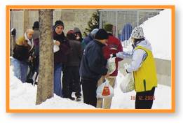 2005年12月18日星期天共修结束后,蒙特利尔同修准备了150份圣诞礼物,于蒙特利尔市中心分赠给无家可归的游民。礼物袋中装有素食三明治、水果、巧克力棒、饮料、毛线帽及手套。 魁北克的12月寒风酷雪,漫长的黑夜始自下午四点至清晨七点。尽管活动当天气温降到摄氏零下十五度(华氏五度),但廿位左右的师兄师姊仍热切地与街头的游民分享圣诞礼物,希望带给他们温暖舒适,即使就这么一天也好。同修们在市中心的人行道及地下铁车站遇见许多游民,便分送礼物给他们,并诚心祝福他们:“清海无上师祝您耶诞快乐!”多数游民都感到相当惊喜,他们很高兴地收下礼物,有的人还询问有关清海无上师的讯息。 随后同修们前往一家提供游民基本所需的收容所“天父之家”(La Maison du Pere)。当他们抵达时,有将近一百人在街上排队等候收容所开门,于是同修立即将所有剩余的礼物分送他们。其中有一位游民很亲切地拿了朵塑胶花献给分送礼物给他的师姊。温馨的气氛很快地弥漫开来,有些人甚至开始讲述自己的人生历程。其中有位男士原先在某家专门生产航空高科技产品的公司工作,他在服务27年后失业了,竟变成一无所有的游民流浪街头,在凛冽的寒风中,连个最基本的御寒帽都没有。正当他叙说自己的遭遇时,许多仍在收容所门口排队等候的游民大声唱颂着:“清海!清海!清海!”不需多说,此时同修们心中都充满了美妙温暖的感觉。