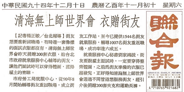 【记者杨正敏/台北报导 】街友想要重新回职场,有时连一套像样的面试衣服都没有,清海无上师世界会昨天捐赠200套衣服,给台北市政府就业服务中心辅导的街友,让他们面试时可以穿得体面,获得雇主的青睐。 市府劳工局就服中心,从90年8月开始辅导街友重回职场,成立街友工作站,至今已提供1544名街友就业服务,辅导1007名街友重返职场,成功率达六成五。 就业服务中心秘书刘家鸿说,街友要跟雇主面试时,一定要穿得整齐体面,之前为街友准备的衣服已经发完,正好得知清海无上师世界会透过不同管道想服务街友,经引介后捐赠200套夹克和运动长裤。 ♥