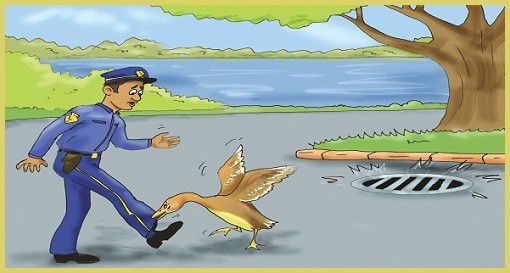 不过,那只鸭子确定彼得森先生还在看着她,便走到稍远的下水道栅栏坐下来。当彼得森先生想要走开时,那只鸭子再度衔住他的裤子,然后又走到栅栏处。这次彼得森先生紧跟着她,去看看为什么她会如此激动;原来她的八个宝宝从栅栏处掉入水中,她正尽全力找人解救他们。