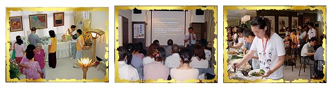 第二场演讲则由三军总医院陈惟华主任医师主讲,他以医学观点来探讨“健康与素食”。演讲内容从人体生理结构、营养饮食、生态与环保、孕妇与新生儿健康等医学观点切入探讨,使与会来宾深刻了解素食的益处。第三场演讲则由中山医学大学吕峰洲教授担纲,讲题为“深度研究自由基与饮食之关系”。吕教授向听众解释自由基与癌症的关系,并于会后进行机智问答,以他的两本著作为奖品,为这场听众爆满的演讲画下美丽的句点。 第四场演讲主题为“爱护动物,尊重生命”,由台湾动物社会研究会朱增宏理事长主讲。会中播放纪录片《台湾农场纪实--这就是我吃的猪肉吗?》说明猪只饲养、屠宰的情况,为现场听众带来极度震撼的效果。 同修于第三、四场演讲之间举办下午茶会,提供许多精心制作的点心。现场以师父的万岁灯、复制画布置,并陈列素食食谱、健康饮食等相关书籍。众多与会来宾专心翻阅师父的画作手册与食谱,并称赞素食茶点的美味。 当天的园游会也特别规划素食专区,同修制作的“您也可以选择这样的生活”的美丽布条,意外地成为整个素食区的招牌,吸引许多来宾光临,特别是现场制作的松饼,从早上开卖就没有停止过,许多民众耐心排队购买。还有一些来宾不断地到我们的摊位重复购买水煎包与义大利面,也有持素的小朋友们在确认过后,欣喜地享用素食小吃。