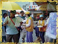 9月17日台风远离,天气放晴,大会邀请亚洲影后陆小芬小姐到美人茶会场,我们赠送她一本《了悟健康》。修佛多年的她拿着师父的书,并表示修禅让她对生命有新的体认,更觉得大家要互相帮助才对!朗朗晴空,引来周末的游客人潮,同修把握机会在当地老街发送“您也可以选择这样的生活”扇子、文件夹及多功能餐垫。多位游客受到师父爱力感召,报名学了方便法。几天活动下来,有近三十位有缘人学习方便法,个个法喜充满。 一位男士原先对师父的衣着打扮不太认同,但经过同修的耐心解说后,他深受师父的善行义举所感动,并报名修方便法。经过30分钟的静坐后,他告诉我们从智慧眼看出去,真的有一个隧道,他在打坐时,通过一个黑色的隧道,看到紫色的光。然后他很腼腆地站起来对师姊鞠躬道谢,并对自己的无知以及误会师父的爱心表达歉意。