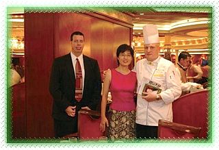 第一与第二天--海上航行 出发当日,我们在迈阿密机场开始分发传单,机场安检人员都拿到一份。有位女士兴奋地告诉我们,长久以来她一直想做同样的事,很感谢我们真的实现这个想法。 第二晚,主厨再度造访,询问我们是否满意他的素食。主厨人既亲切又热心,我们送给他师父的样书与杂志,并答应寄一本无上家厨给他。大部分的服务人员也都知道我们吃素,服务相当周到。我们也将新闻杂志或样书赠送给有兴趣的人。