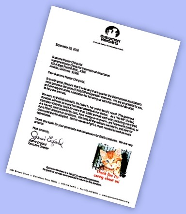 清海无上师钧鉴: 我满怀欣喜地提笔向您表达谢意,感谢贵会慷慨捐赠美金一万元给“关怀行动”(Operation Kindness)。我们很感激您和贵会所有会员,让我们有幸运用这笔善款来帮助动物。 这项慷慨的捐款将帮助我们收容所里的许多流浪动物。“关怀行动”是一家不扑杀生命的动物收容所,每年照料的动物超过2,600只,其中包括许多受伤的动物,以及被车子撞伤、患有癣疥之疾、犬心丝虫症或其他病症的动物,我们收容及医治它们,并照料它们直到被领养为止。因此这份厚礼正是我们迫切需要的,我们对此心存感激。 再次感谢您的慷慨捐赠,以及您对上帝所造的动物朋友的慈悲关怀。我们非常感谢您。
