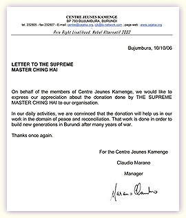 福尔摩沙新闻组越洋电话采访(原文为中文) 时时刻刻关心众生需要的师父,继指示同修在肯亚开挖了三口井(目前第四口井已开始进行),抛砖引玉引起国际社会关注肯亚旱灾后,又马上捐助邻国蒲隆地(Burundi)的“喀门集青年中心”(Kamenge Youth Center)美金三万元,支援开设辅助教育课程,将源源不绝的爱力灌注在东非较不为人知的角落。 蒲隆地长年以来内部一直有种族问题,尤其从1993年起,战乱就没有停息过。十几年来,敌对的胡图族(Hutu)和图西族(Tutsi)经常爆发流血冲突,但由于上帝的加持以及各方的努力协调,友谊之花已逐渐在两族之间绽放。近几年来,内部冲突逐渐缓解,黄金3年(2006年)9月,蒲隆地最后一支反抗军,终于签署了停火协议。 战乱期间,位于胡图族和图西族社区之间的“喀门集青年中心”默默致力于和平以及教育的工作,它是由三位义大利沙勿略传教士所创立,由所属义大利教会提供援助,提供教育课程及各种活动,让胡图族和图西族的青年可以在此一起学习、育乐和工作,为他们的下一代开创更美好的将来。 经“无上师电视频道”(SMTV)报导这个青年中心的爱心理想以及无条件的奉献精神后,师父特别指示赞助美金三万元。为了传递师父的爱心资助,我们前往拜访“喀门集青年中心”。该中心位于市区偏远处,虽处于较贫穷的区域,但整个中心看起来很干净、亮丽,我们也见到附近居民来到中心领取玉米、药品、农耕工具等救济物资。 中心的负责人在了解我们来访的目的后,表达了欢迎之意以及对师父的感谢,并且向我们简介中心的情况。他表示现有26,000名学员,上课不需缴交任何费用,自选课程,自由进出;中心有义工约45人,半薪义工约82人,为了安排全天候的课程,工作非常忙碌。我们看他们虽然忙碌,但却显得很有精神,也很有制度。 “喀门集青年中心”致力于和平工作的精神很值得推崇,其影响力深植人心,也让我们印象深刻。我们也很感谢上帝,让我们有机会将师父的爱传递给蒲隆地人民,一路上不仅体会到和谐与和平的意义,更感觉到这真是一趟荣耀之旅。
