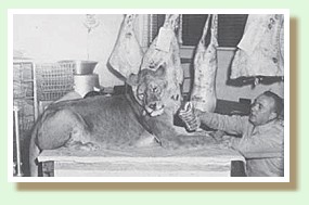 “小淘气”从出生以来就不肯吃任何动物的肉,这只素食狮子典型的一餐包括:含有适量蛋白质的各种谷类、钙质、油脂和粗饲料。玛格丽特总会事先煮好数天的分量,喂食的时候抓两把煮熟的谷类掺入半加仑牛奶,就供应了“小淘气”美味的一餐,还有它最喜欢的橡皮娃娃一定要放在身边才行!“小淘气”拒绝啃食任何骨头,因此为了增强它的牙齿和牙龈,照顾它的人会在橡胶鞋上喷洒香水,来吸引它去啃嚼。