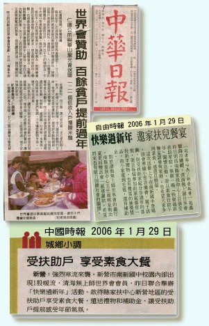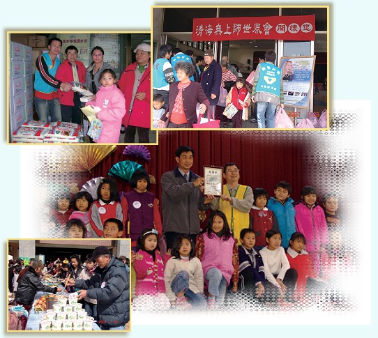 岁末寒冬,台南小中心于黄金4年(2007年)1月28日,在台南县新营市南新国中大礼堂举办了一场“快乐过新年”的爱心活动,对象是台南县家扶中心所扶助的上百个清寒单亲家庭。除了精心准备的小型音乐会、亲子活动、美味素食飨宴外,并赠送每户家庭一份新年礼物,此外还提供100份丰富的抽奖赠品,从小家电到毛毯,应有尽有。同修也针对20户急需援助的家庭,每户致赠慰问金五仟元,让他们能欢乐过新年!这场活动吸引了许多媒体记者的采访报导。 一位独力抚养3名子女的女士,全家都茹素。她表示当天进入会场时就感到一股非常强大的能量,尤其看到师父的法相时,感觉非常熟悉,原来在前一晚的梦境中,师父已来看过她了,而且还穿着和法相一模一样的衣服,令她非常感动。 会中,家扶中心周明泉主任与20位受扶助小朋友代表家扶中心颁赠感谢状给清海无上师世界会,主任并一再感恩师父的恩泽,同时祝福师父新年快乐!