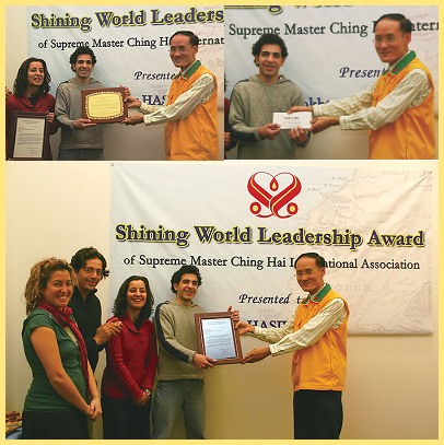 Hasbini) 由于最近的一场战争,导致一万五千吨的原油外泄,这是地中海有史以来最大的环境污染危机。事件发生的第一天,莫克塔.汉斯比尼就来到海滩,在枪炮声仍未止息之际展开净滩的工作。他不仅清理海滩,而且还拍摄照片,散播给媒体报导,使大众能明了污染的严重性。在几个星期内,这项义举就得到了回应,政府大力地进行清理的工作。莫克塔的确为大家树立了好榜样,更是年轻人效法的楷模! 获颁这份奖项时,莫克塔.汉斯比尼表达了对清海无上师的深深谢意,他期望其他青年同胞也能积极改善世界,使世界变得更美好! 稍后在2月11日,莫克塔藉由电子邮件向师父表示:“我的辛苦努力能够受到表彰,并获赠这份礼物,激励我再接再厉,追求更完善的目标,令我深感荣幸…。您的慷慨之举为我的人生带来了深远的影响,我由衷感激能获得您的奖励。获颁此项“全球优秀领导奖”,让我受益无穷…。”