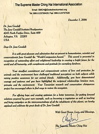 多年来,古德博士已成为一名保育和社运人士。她呼吁人们保护动物和环境,推动年轻人的人本教育,并于1977年成立了“国际珍古德教育及保育协会”,来持续支持野生黑猩猩的实地研究。如今,“国际珍古德协会”的使命在于扩展个人力量,在资讯充足的情况下采取富有爱心的行动,为一切众生改善环境。该协会不但在致力保护黑猩猩及其栖息地方面居于领导地位,更由于在非洲施行创新的以社区为中心的保育发展计划,以及遍行七十多国的“根与芽”(Roots & Shoots)教育计划而广受肯定。 尽管行程紧凑,又有不胜枚举的计划需要处理,古德博士却总是看起来一派气定神闲,她为什么能够这么平静自在?答案就在她的著作《希望:灵性之旅》(Reason for Hope: A Spiritual Journey)一书中。在这本书里,她提到在参观一座教堂时的体验,当时她所听到的内在音乐,让她感受到永恒的天堂至喜。她相信这个内在的灵性体验及其他祥和的内在音流体验,使她和上帝的力量连结在一起,激励她担任上帝的使者,传播上帝的讯息:人类应该与动物朋友建立和谐的关系。就因为她对上帝的坚定信念以及对所有众生的纯然爱心,使她无条件地为世界从事这份无私的工作。古德博士充满爱心、勇气和谦卑心,是世人的美好典范。她屡获殊荣,包括获颁“甘地─金恩非暴力奖”(Gandhi-King Award for Non-Violence);2002年4月,当时的联合国秘书长安南(Annan)更委任她为联合国的“和平大使”。此外,她也为大人和小孩出版了许多著作。 古德博士由于行程繁忙,不克出席颁奖仪式。我们在等待与“国际珍古德协会”会长比尔.强斯顿先生(Bill Johnston)见面时,受到讯息交流处副处长的热烈欢迎与殷勤招待。强斯顿先生代表古德博士领奖时表示:“这是无上的光荣。”他告诉我们,师父的赠款将帮助协会在全球各地创造“永续的生活”。 颁奖仪式之后,维吉尼亚小中心的一位同修与强斯顿先生谈及“国际珍古德协会”。强斯顿先生与有荣焉地告诉我们,由于今年是协会成立的第三十周年,全球各地将举办活动,以庆祝协会在非洲各地获致的各项伟大成就,包括黑猩猩保育和森林保育工作等等。强斯顿先生并说明森林砍伐是黑猩猩所面临的最大威胁,衍生了野生动物肉品交易的问题,许多猎人猎食包括黑猩猩在内的野生动物。强斯顿先生也告诉我们,古德博士是位素食者,而且董事会一直都供应素食餐点。 强斯顿先生接着表示,儿童和教育是古德博士最关心的议题;她提出的“根与芽”计划,让各年龄层的孩子都能为自己的社区、动物和环保奉献一己之力。这个计划的名称具有象征意义,“根”建构了稳固的基础,而“芽”则能破土而出,迎向阳光。最后强斯顿先生说道:“珍是无可取代的,她无与伦比。”当我们离去时,每个人对于能够参与这项上帝所派遣的任务,都深感荣幸与备受加持。