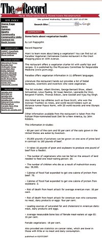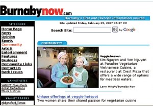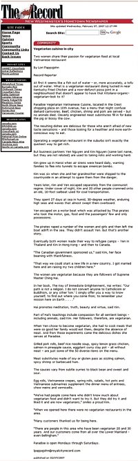 天堂素面馆(Paradise Vegetarian Noodle House)是同修在卑诗省(British Columbia)大温哥华地区(Greater Vancouver)所经营的一家素食餐馆,至今已开张三年了。每隔几个月,温哥华的两大报之一就会主动对这家餐馆做非常正面的报导。拥有这家餐馆的两位同修最近表示,他们的顾客对素食的支持度已大幅提升,许多来店里品尝过素食的顾客下次再来光顾时,都说他们已经成为素食者了!在同修的餐馆中,也提供素食食谱与相关资讯,包括“您也可以选择这样的生活”传单及11种语文版本的样书。 这家餐馆位于大温哥华地区的两个小城市之间。2月7日与9日,这两座城市的社区报纸《新西敏报》(New Westminster)与《本纳比报》(Burnaby),也分别对这家餐馆做了非常正面又详尽的精采报导,内容包括“您也可以选择这样的生活”讯息、清海无上师阐述有关爱心对待所有众生的教理,以及素食的利益,这些文章皆可在网路上点阅浏览。这两份报纸发送给住户的流通量合计约六万五千多份,此外亦可在许多公共场所看到。 的确,素食天堂就在此时此刻,而且有越来越多的人欣然加入这个行列!