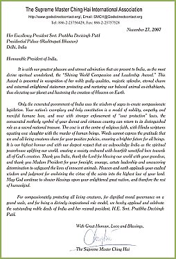 值得注意的是,印度以国家的立场矢志保护牛只。除了二十八个邦中的少数几个邦以及中央直辖区之外,印度境内牛只的生命都受到法律的保护。1960年制定的“防止虐待动物法”(Prevention of Cruelty to Animals Act)将牛只的保护纳入规范,印度宪法更明文禁止屠杀牛只。宪法第48条载明:“政府当致力规划以现代化的科学方法发展农业与饲养动物,尤其应当采取措施保护并改善品种,且禁止屠杀牛只、小牛犊,以及其他的乳牛和耕牛。”第51条A项g款更进一步规定:“保护及改善自然环境--包括森林、湖泊、河川和野生生物,并善待一切众生,是印度全体人民的基本义务。” 近来,印度备受尊敬的政坛人士已采取更严厉的取缔措施,切实执行现行的法律,并针对各地的需求,提出新的法规,以提高牛只的保护。我们最亲爱的师父为了表达崇高的敬意与衷心的感激,她慈蔼地颁赠“全球优秀爱心奖”及“全球优秀领导奖”予印度,以感谢他们保护这些神圣的动物。愿上帝持续加持印度,也期望有越来越多国家能从印度善待美丽和平的牛儿们这项开悟之举中获得启发。