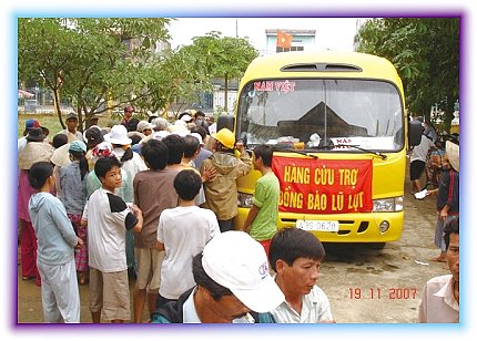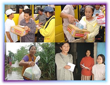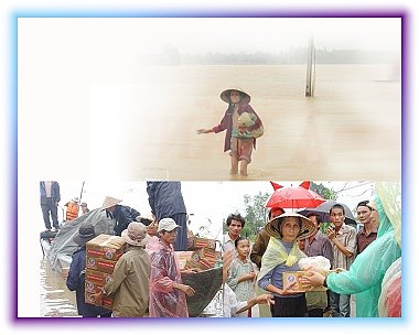 承天省(Thừa Thiên)和顺化市(Huế)接二连三遭到天灾肆虐,各级政府虽立即对灾民提供及时的救援,然而由于长期水患,灾民的日常生活变得非常艰困。感谢师父的圣爱与安排,顺化市的同修才得以购买白米、素食面、毯子和药品等赈灾物品去帮助灾民。 尽管我们在路上遇到许多因水灾而造成的困难与问题,但每件事情都进行得很顺利。此外,由于同修的热心支援和当地政府的极力配合,世界会会员得以直接将赈灾物品送达灾民手中。在整个赈灾期间没有下半点雨,使我们避免了物资淋湿的问题。由于感受到师父无边的关爱,许多灾民感激涕零,每个人的脸上也都露出欣喜之情。