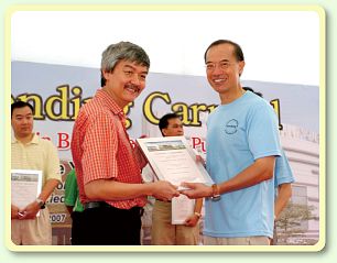 在新加坡外交部长兼阿裕尼集选区国会议员杨荣文先生的带领下,大家愉快地展开晨间快步健行活动,由此揭开了嘉年华会的序幕。会场设有游戏摊位、科学发明展和儿童游乐场,让亲子享受充满趣味的户外活动。参观民众也有机会欣赏传统马来、印度及现代歌舞表演。其他的表演节目还包括了振奋人心的舞狮表演,将现场气氛带入高潮。 我们很高兴看到许多佛教团体所设立的餐饮摊位,供应各式各样的素食餐点。同修们除了贩卖素食品、分发“您也可以选择这样的生活”传单,也利用机会分发“无上师电视台”的传单和书签,来宣扬“无上师电视台”播送范围扩及全球的好消息。当天大约有四千人参加这场活动。 为了和大众分享师父对动物朋友的关爱,我们提供了六本《真爱奇遇--我的鸟羽兄弟》给主办单位作为摸彩奖品。新加坡外交部长杨荣文先生也颁发感谢状给新加坡小中心及其他与会团体,感谢大家共襄盛举,并协助基金的筹募。
