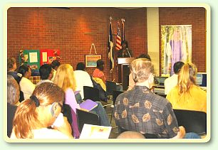 【印第安那讯】黄金4年(2007年)10月27日,美国印第安那小中心的同修在共修之后前往当地一座图书馆,为规划好的录影带弘法讲座布置会场。