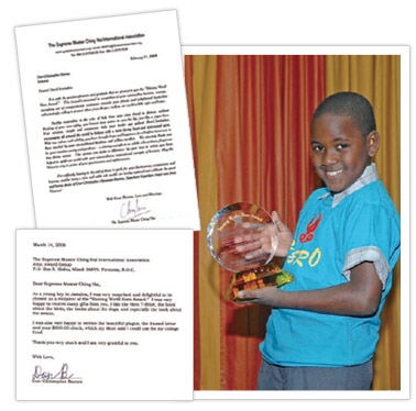 2007年的某一天,牙买加金士顿(Kingston)的九岁男童唐–克李斯多夫.巴纳斯(Don-Christopher Barnes),在游泳池附近听到朋友的弟弟大声叫喊他的名字,他跑过去查看后,发现他的朋友面部朝下躺在游泳池深水处的底部。由于他只有三尺八吋高,唐首先想到向大人求救,但是又不想浪费时间,于是他处变不惊地立即跳进泳池,将他的朋友拖到浅水处。唐因为这项杰出的英勇事迹,而被学校、社区和家人视为英雄,并受到牙买加总理授予国家英勇荣誉勋章的表扬。 有感于这位男孩勇敢慈悲的义举,师父也颁给他“全球优秀英雄奖”。颁奖仪式于黄金5年(2008年)3月8日在金士顿的一家大饭店举行,由佛罗里达小中心的同修主持。当同修朗读了师父的褒奖函之后,唐穿着他先前收到的英雄T恤,上台领取精心裱框的师父信函、水晶奖牌、500美元的支票,以及装满师父精采书籍的礼物袋。唐接着在来宾面前朗读一封他写给师父的信,以表达他深深的感激之情。大家都对唐的聪明、冷静和充满喜乐的模样留下深刻的印象。 此外,同修也把握机会分发有关全球暖化的“紧急求救”传单给观礼的来宾;许多人都说他们会和亲友与同事分享这个讯息。对佛罗里达同修来说,能够代表师父表扬少年英雄唐–克李斯多夫.巴纳斯的英勇事迹,真是一次难能可贵的经验。