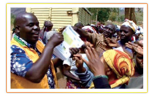 救援队也与人们分享“您也可以选择这样的生活”讯息。他们似乎非常渴望收到有关素食以及素食如何利益健康并帮助他们改善现况的资讯,所以纷纷从难民营涌来拿取这张美丽的传单。 当收到救援物品时,身兼荣盖教会联盟协调员暨荣盖青年行动(Rongai Youth