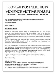 2008年3月21日,清海无上师世界会会员组成的肯亚救援队前往纳库鲁(Nakuru)一带,帮助最近因肯亚内乱而流离失所的难民。清海无上师在获悉肯亚人民的处境后,立即慈悲捐赠了2万美元作为救援基金。 救援队队员在评估情况后,认定有三个地区需要援助,包括索雷(Solay)警察局、阿圭西(Akuisi)难民营和肯亚农会(KFA)难民营,这些地区都尚未得到任何协助。