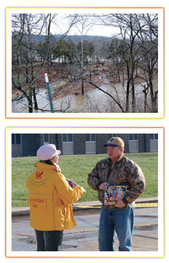2008年3月17日与18日两天的豪雨,在密苏里州皮得蒙市(Piedmont)引发自1982年以来最严重的水灾,市中心大部分街道积水达3尺深,该市2,000名居民中有100多人必须撤离家园。 位于罗拉(Rolla)的密苏里小中心得知水灾的消息后,于3月19日派遣一支救援队前往受灾地区。同修们造访位于山顶上一所教堂的收容所,分发瓶装水、三明治与点心给水患灾民,并运送其他救援物资给该收容所及设立于当地一所高中的救援物资分配中心。一位红十字会工作人员从我们穿着的黄背心认出我们团体,因为同修最近在阿肯色州的龙卷风赈灾任务中也如此穿着,她与其他志工向我们表达谢意,感谢世界会致力协助各种救灾工作。 在执行救灾任务时,救援队也将“紧急求救”传单分送给当地的救援人员,其中一位志工刚好是皮得蒙校区的督学,我们请他代为分送师父的书籍给该区的中、小学图书馆。师兄、师姊们都很感谢上帝的特别安排,并让我们有机会服务他人。