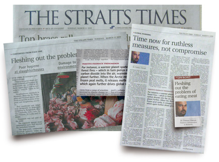 同修开始分发传单后不久,新加坡主要的英文报纸《海峡时报》(Straits Times)也刊载了两篇文章,标题分别是“探讨食肉的问题”(Fleshing