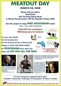 澳洲柏斯 第三届国际无肉日活动 柏斯同修参加在梅铎大学(Murdoch University)所举行的“无肉日”活动。他们在会场分发传单,并播放美国航太总署所发布有关气候变迁的讯息,以及师父提醒世人关于全球暖化的影片。